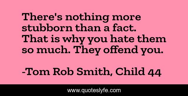 This page presents the quote "There's nothing more stubborn than a fact. That is why you hate them so much. They offend you.". Author of this quote is Tom Rob Smith, Child 44. This quote is about facts, stubborn,.