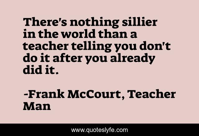 This page presents the quote "There's nothing sillier in the world than a teacher telling you don't do it after you already did it.". Author of this quote is Frank McCourt, Teacher Man. This quote is about teaching, humor, silliness,.