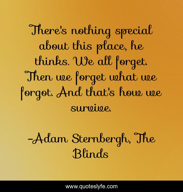 This page presents the quote "There's nothing special about this place, he thinks. We all forget. Then we forget what we forgot. And that's how we survive.". Author of this quote is Adam Sternbergh, The Blinds. This quote is about memory-loss, forget, survival, forgot, forgotten, nothing, survive,.