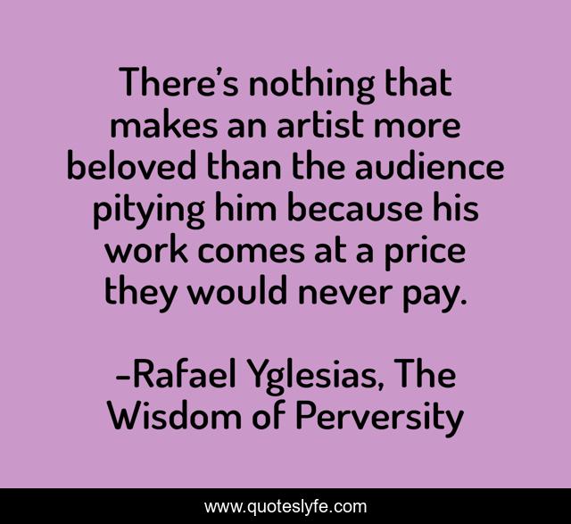 This page presents the quote "There’s nothing that makes an artist more beloved than the audience pitying him because his work comes at a price they would never pay.". Author of this quote is Rafael Yglesias, The Wisdom of Perversity. This quote is about audience, artist,.