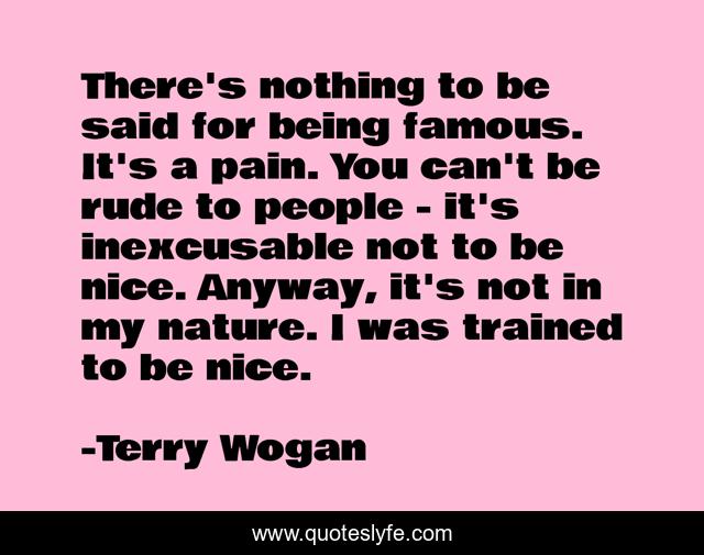This page presents the quote "There's nothing to be said for being famous. It's a pain. You can't be rude to people - it's inexcusable not to be nice. Anyway, it's not in my nature. I was trained to be nice.". Author of this quote is Terry Wogan. This quote is about nature, pain, people,.