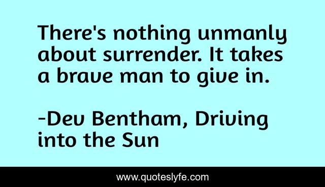 This page presents the quote "There's nothing unmanly about surrender. It takes a brave man to give in.". Author of this quote is Dev Bentham, Driving into the Sun. This quote is about surrender, manliness,.