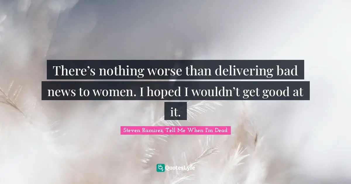 This page presents the quote "There’s nothing worse than delivering bad news to women. I hoped I wouldn’t get good at it.". Author of this quote is Steven Ramirez, Tell Me When I'm Dead. This quote is about drunk, novel, dead, zombie-thriller, soldiers, paranormal-thriller, horde, na, hordes,.