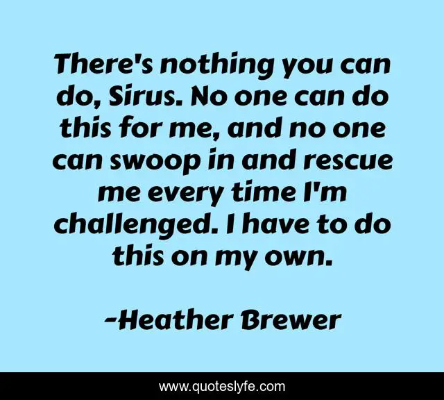 This page presents the quote "There's nothing you can do, Sirus. No one can do this for me, and no one can swoop in and rescue me every time I'm challenged. I have to do this on my own.". Author of this quote is Heather Brewer. This quote is about bravery, unsaid-words, realization,.