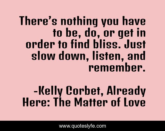 This page presents the quote "There’s nothing you have to be, do, or get in order to find bliss. Just slow down, listen, and remember.". Author of this quote is Kelly Corbet, Already Here: The Matter of Love. .