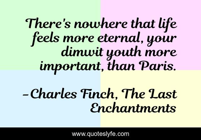 This page presents the quote "There's nowhere that life feels more eternal, your dimwit youth more important, than Paris.". Author of this quote is Charles Finch, The Last Enchantments. This quote is about paris, youth, france,.