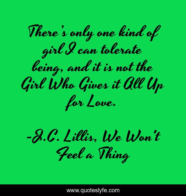 This page presents the quote "There’s only one kind of girl I can tolerate being, and it is not the Girl Who Gives it All Up for Love.". Author of this quote is J.C. Lillis, We Won't Feel a Thing. This quote is about relationships, love, goals, affection,.