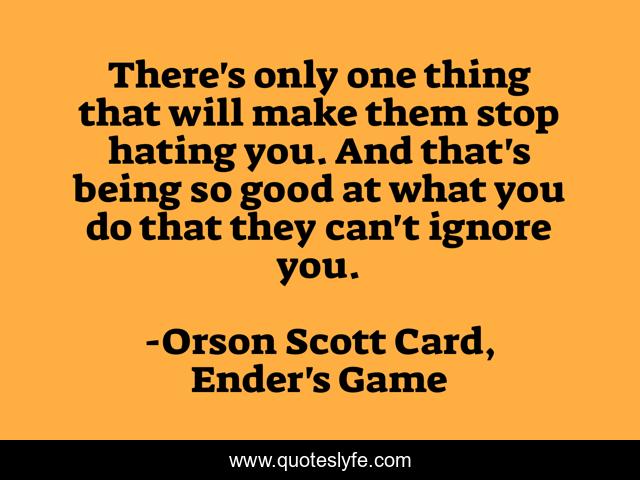 This page presents the quote "There's only one thing that will make them stop hating you. And that's being so good at what you do that they can't ignore you.". Author of this quote is Orson Scott Card, Ender's Game. This quote is about confidence, ender, positive, motivational, optimistic, inspirational, enthusiasm,.