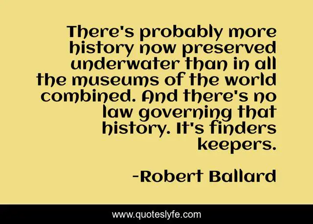 This page presents the quote "There's probably more history now preserved underwater than in all the museums of the world combined. And there's no law governing that history. It's finders keepers.". Author of this quote is Robert Ballard. This quote is about world, law, underwater,.