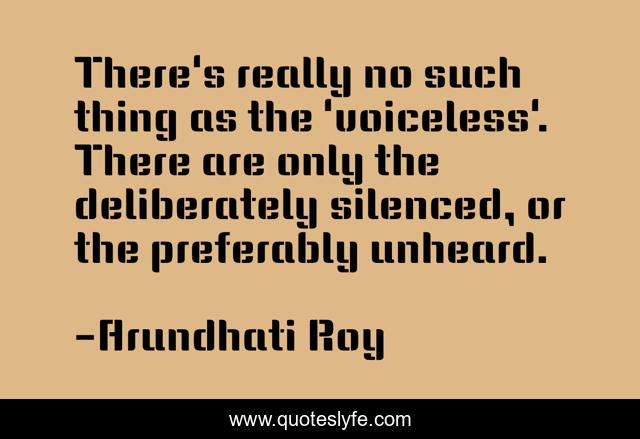 This page presents the quote "There's really no such thing as the 'voiceless'. There are only the deliberately silenced, or the preferably unheard.". Author of this quote is Arundhati Roy. This quote is about ignored, silenced, voiceless, unheard, subaltern, silence,.