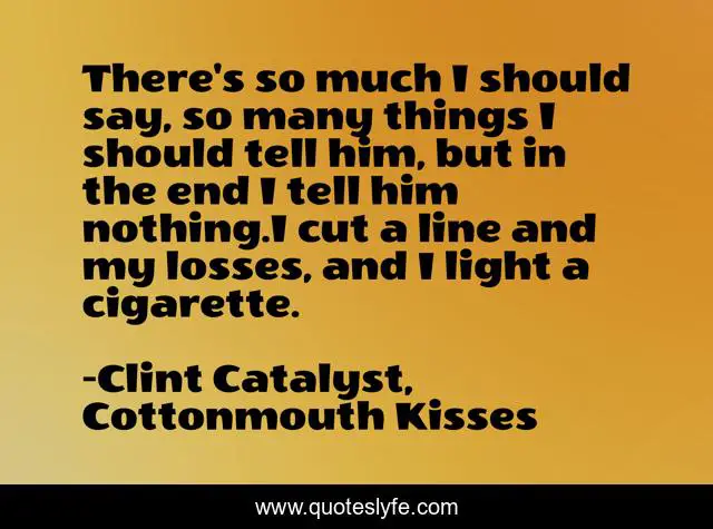 This page presents the quote "There's so much I should say, so many things I should tell him, but in the end I tell him nothing.I cut a line and my losses, and I light a cigarette.". Author of this quote is Clint Catalyst, Cottonmouth Kisses. This quote is about ennui, loneliness, apathy, addiction, love-lost,.