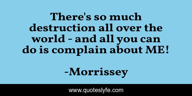 This page presents the quote "There's so much destruction all over the world - and all you can do is complain about ME!". Author of this quote is Morrissey. This quote is about life, humor, lyrics, music, love, affection,.