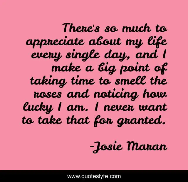 This page presents the quote "There's so much to appreciate about my life every single day, and I make a big point of taking time to smell the roses and noticing how lucky I am. I never want to take that for granted.". Author of this quote is Josie Maran. This quote is about life, day,.