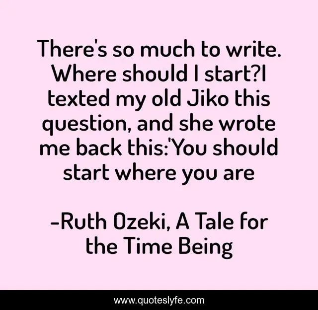 This page presents the quote "There's so much to write. Where should I start?I texted my old Jiko this question, and she wrote me back this:'You should start where you are". Author of this quote is Ruth Ozeki, A Tale for the Time Being. This quote is about individuality, beginnings, startup, creativity, perspective, inspirational, enthusiasm, present,.