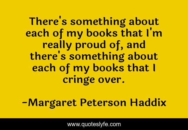 This page presents the quote "There's something about each of my books that I'm really proud of, and there's something about each of my books that I cringe over.". Author of this quote is Margaret Peterson Haddix. This quote is about books, author, writing,.