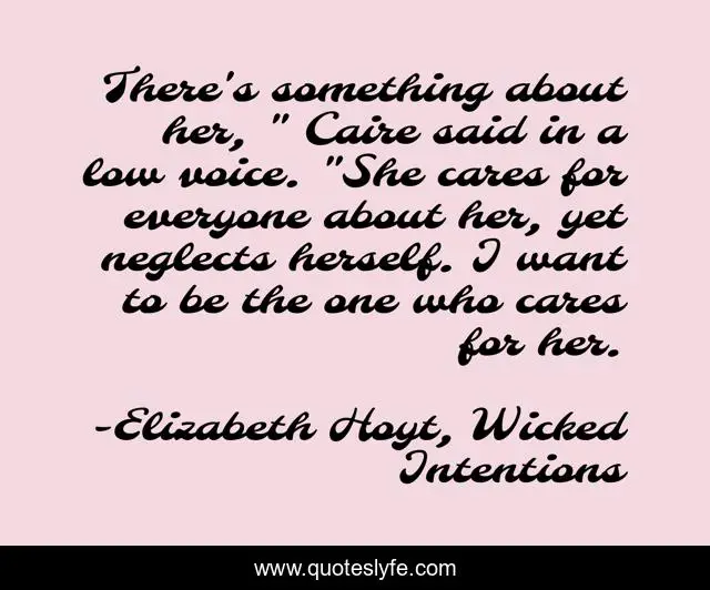 This page presents the quote "There's something about her, " Caire said in a low voice. "She cares for everyone about her, yet neglects herself. I want to be the one who cares for her.". Author of this quote is Elizabeth Hoyt, Wicked Intentions. .