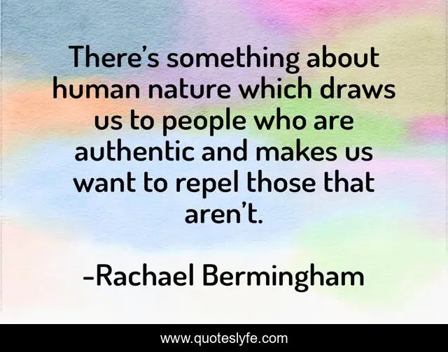 This page presents the quote "There’s something about human nature which draws us to people who are authentic and makes us want to repel those that aren’t.". Author of this quote is Rachael Bermingham. This quote is about confidence, law-of-attraction, motivational, optimistic, inspirational, human-nature, enthusiasm, positive,.
