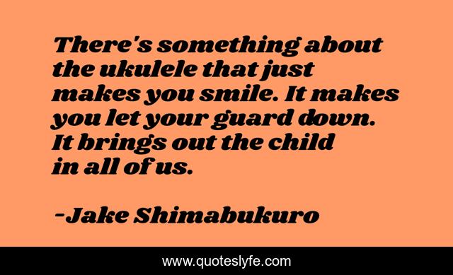 This page presents the quote "There's something about the ukulele that just makes you smile. It makes you let your guard down. It brings out the child in all of us.". Author of this quote is Jake Shimabukuro. This quote is about down, child,.