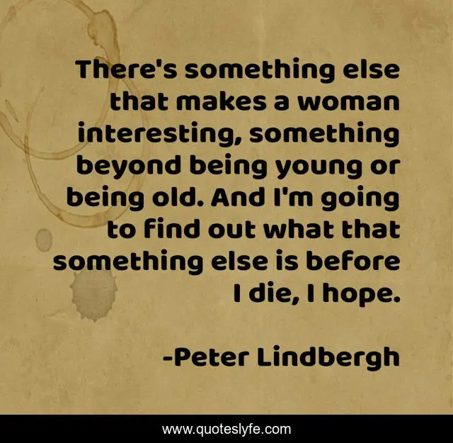 This page presents the quote "There's something else that makes a woman interesting, something beyond being young or being old. And I'm going to find out what that something else is before I die, I hope.". Author of this quote is Peter Lindbergh. This quote is about interesting, woman, die,.