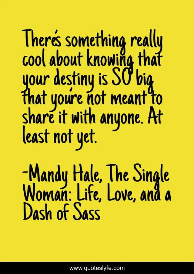 This page presents the quote "There’s something really cool about knowing that your destiny is SO big that you’re not meant to share it with anyone. At least not yet.". Author of this quote is Mandy Hale, The Single Woman: Life, Love, and a Dash of Sass. This quote is about single-life, faith, life, faith-in-yourself, love, destiny, finding-yourself, singleness, single,.