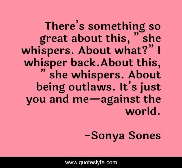 This page presents the quote "There’s something so great about this, ” she whispers. About what?” I whisper back.About this, ” she whispers. About being outlaws. It’s just you and me—against the world.". Author of this quote is Sonya Sones. .