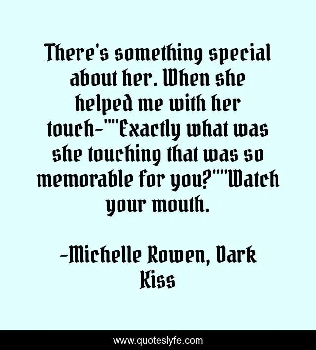 This page presents the quote "There's something special about her. When she helped me with her touch-""Exactly what was she touching that was so memorable for you?""Watch your mouth.". Author of this quote is Michelle Rowen, Dark Kiss. This quote is about dark, bishop, kiss, kraven,.