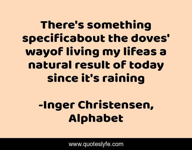 This page presents the quote "There's something specificabout the doves' wayof living my lifeas a natural result of today since it's raining". Author of this quote is Inger Christensen, Alphabet. This quote is about doves, life, peace, rain, today,.