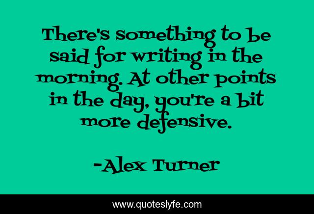 This page presents the quote "There's something to be said for writing in the morning. At other points in the day, you're a bit more defensive.". Author of this quote is Alex Turner. This quote is about day, writing,.