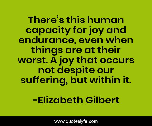 This page presents the quote "There’s this human capacity for joy and endurance, even when things are at their worst. A joy that occurs not despite our suffering, but within it.". Author of this quote is Elizabeth Gilbert. This quote is about joy, endurance, suffering, happiness,.