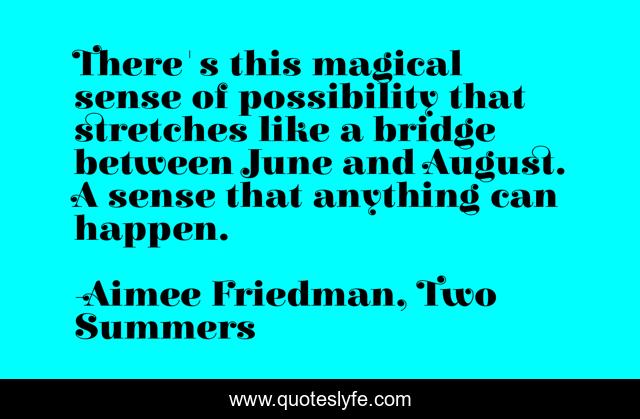 This page presents the quote "There's this magical sense of possibility that stretches like a bridge between June and August. A sense that anything can happen.". Author of this quote is Aimee Friedman, Two Summers. .