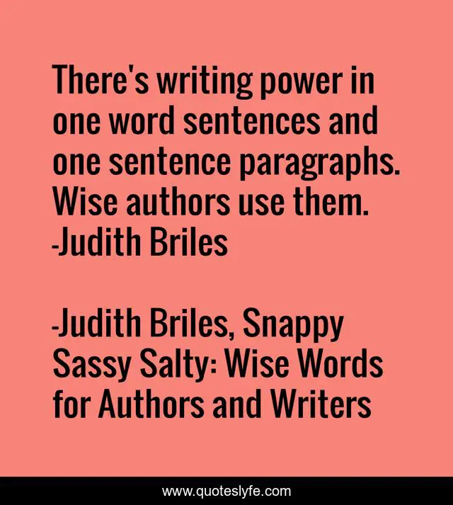This page presents the quote "There's writing power in one word sentences and one sentence paragraphs. Wise authors use them. -Judith Briles". Author of this quote is Judith Briles, Snappy Sassy Salty: Wise Words for Authors and Writers. This quote is about authors, book-success, how-to-get-published, writing,.