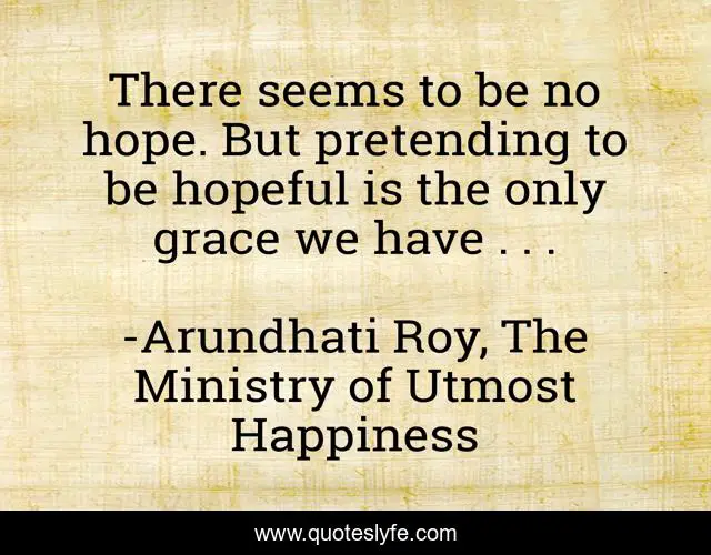 This page presents the quote "There seems to be no hope. But pretending to be hopeful is the only grace we have . . .". Author of this quote is Arundhati Roy, The Ministry of Utmost Happiness. This quote is about hopelessness, hope,.