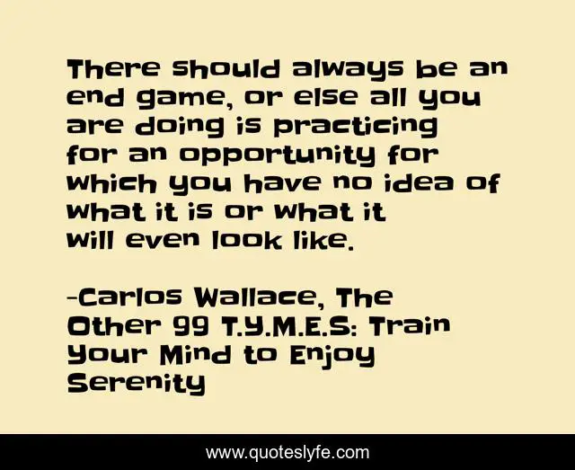 "Carlos Wallace, The Other 99 T.Y.M.E.S: Train Your Mind to Enjoy Serenity Quotes." Quoteslyfe.com, 2025. Fri. 05 Dec. 2025. <https://www.quoteslyfe.com/quote/There-should-always-be-an-end-game-106102>.