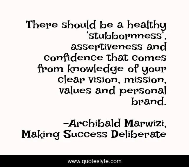 This page presents the quote "There should be a healthy ‘stubbornness’, assertiveness and confidence that comes from knowledge of your clear vision, mission, values and personal brand.". Author of this quote is Archibald Marwizi, Making Success Deliberate. This quote is about life, success, behaviour, attitude, legacy, growth, purpose, inspirational, leadership,.