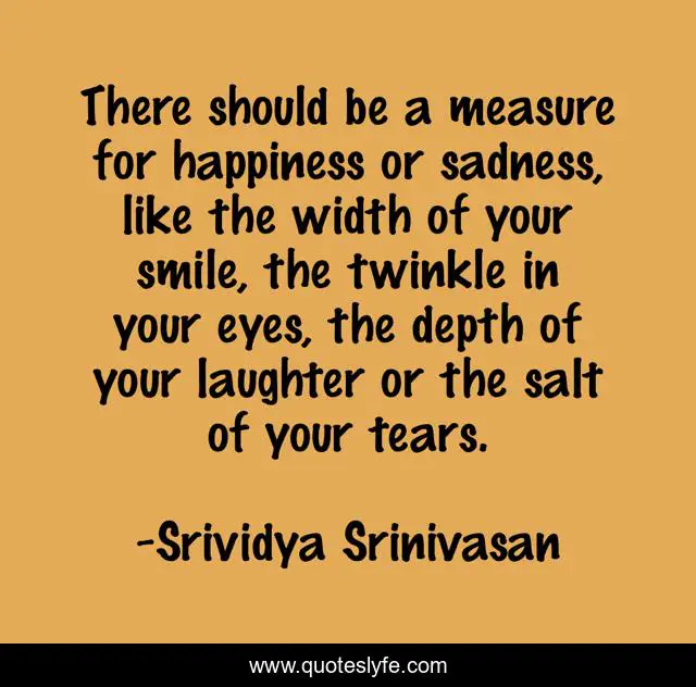 This page presents the quote "There should be a measure for happiness or sadness, like the width of your smile, the twinkle in your eyes, the depth of your laughter or the salt of your tears.". Author of this quote is Srividya Srinivasan. This quote is about twinkle-in-the-eye, laughter-is-beautiful, sadness, tears, happiness,.