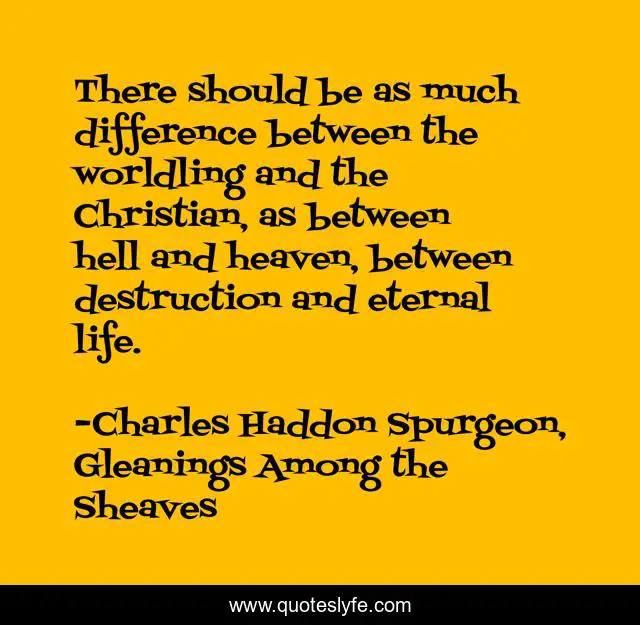 This page presents the quote "There should be as much difference between the worldling and the Christian, as between hell and heaven, between destruction and eternal life.". Author of this quote is Charles Haddon Spurgeon, Gleanings Among the Sheaves. This quote is about chosen, distinction, christian-living, separation, sanctification,.