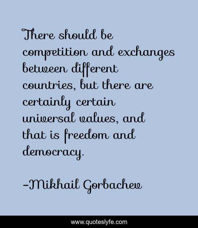This page presents the quote "There should be competition and exchanges between different countries, but there are certainly certain universal values, and that is freedom and democracy.". Author of this quote is Mikhail Gorbachev. This quote is about competition, democracy,.