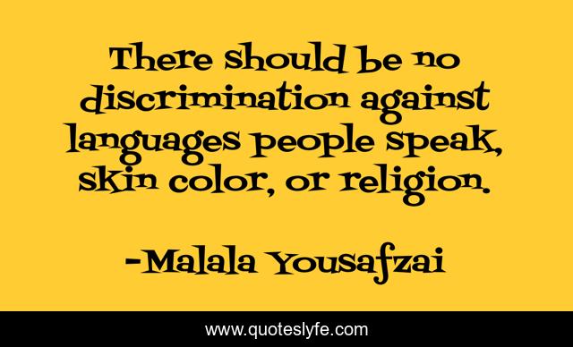 This page presents the quote "There should be no discrimination against languages people speak, skin color, or religion.". Author of this quote is Malala Yousafzai. This quote is about color, religion, speak,.