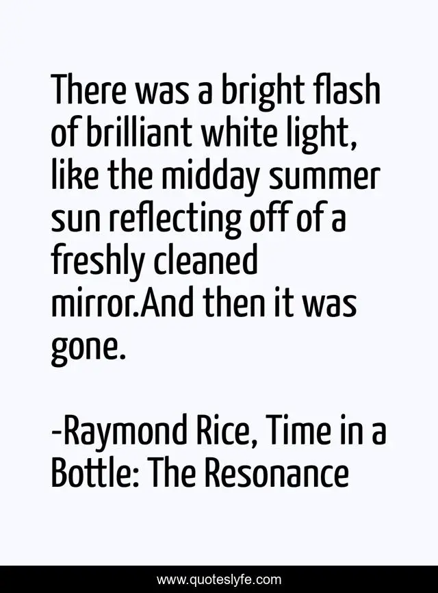 This page presents the quote "There was a bright flash of brilliant white light, like the midday summer sun reflecting off of a freshly cleaned mirror.And then it was gone.". Author of this quote is Raymond Rice, Time in a Bottle: The Resonance. This quote is about spiritual, love, reincarnation, supernatural, suspense, affection,.