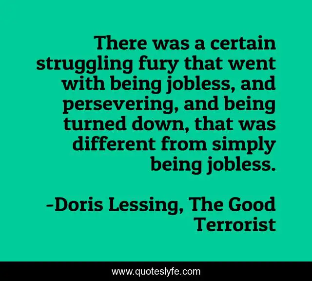 This page presents the quote "There was a certain struggling fury that went with being jobless, and persevering, and being turned down, that was different from simply being jobless.". Author of this quote is Doris Lessing, The Good Terrorist. .