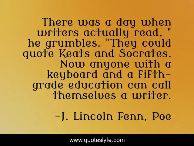 This page presents the quote "There was a day when writers actually read, " he grumbles. "They could quote Keats and Socrates. Now anyone with a keyboard and a fifth-grade education can call themselves a writer.". Author of this quote is J. Lincoln Fenn, Poe. This quote is about reading-books, writer, writers,.