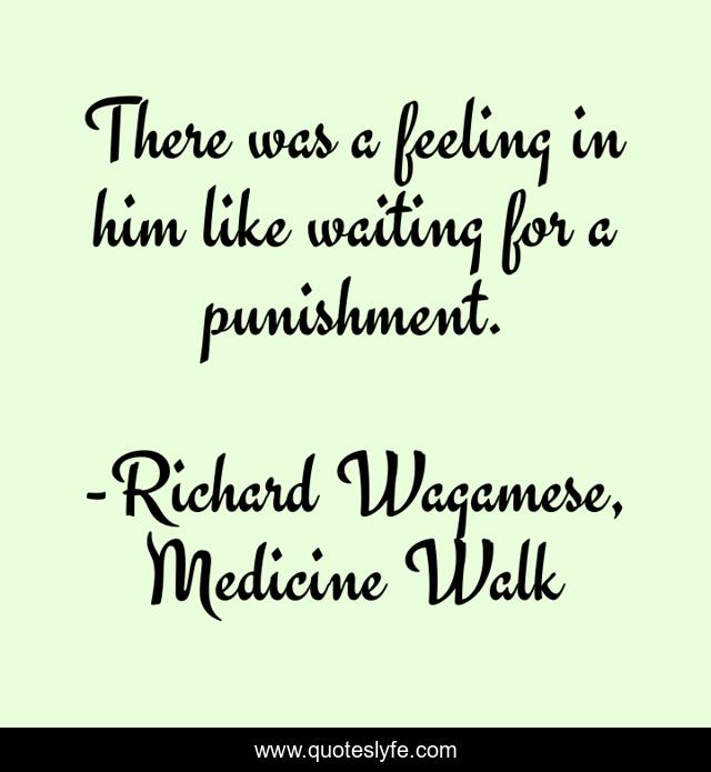 This page presents the quote "There was a feeling in him like waiting for a punishment.". Author of this quote is Richard Wagamese, Medicine Walk. This quote is about first-nations, aboriginal, punishment, waiting,.
