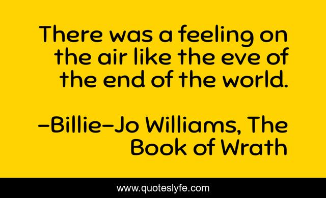This page presents the quote "There was a feeling on the air like the eve of the end of the world.". Author of this quote is Billie-Jo Williams, The Book of Wrath. This quote is about good-vs-evil, pirates, angel, series, dragons, fantasy, nook, vampires, romance,.
