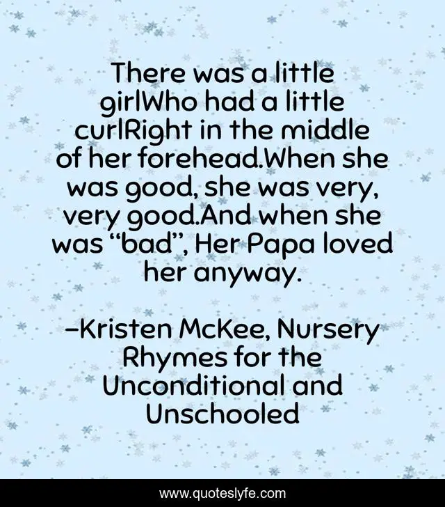 This page presents the quote "There was a little girlWho had a little curlRight in the middle of her forehead.When she was good, she was very, very good.And when she was “bad”, Her Papa loved her anyway.". Author of this quote is Kristen McKee, Nursery Rhymes for the Unconditional and Unschooled. This quote is about unschooling, rewriting-history, partnership, unconditional-love, kindness, unconditional,.