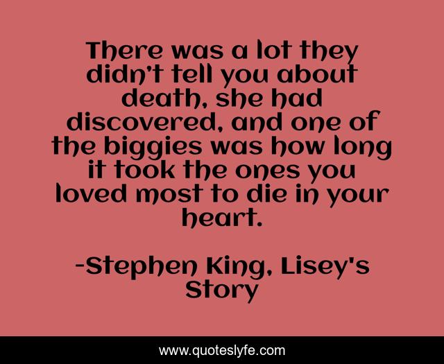 This page presents the quote "There was a lot they didn’t tell you about death, she had discovered, and one of the biggies was how long it took the ones you loved most to die in your heart.". Author of this quote is Stephen King, Lisey's Story. This quote is about stephen-king, death, love, affection,.