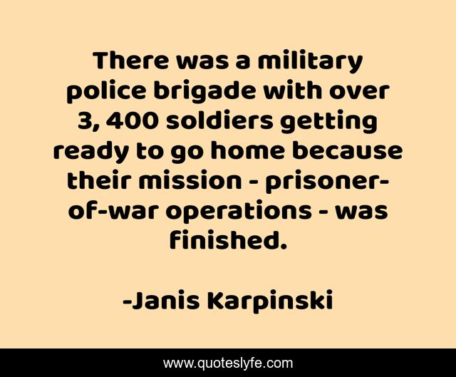 This page presents the quote "There was a military police brigade with over 3, 400 soldiers getting ready to go home because their mission - prisoner-of-war operations - was finished.". Author of this quote is Janis Karpinski. This quote is about military, police, mission,.