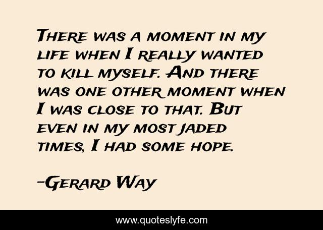 This page presents the quote "There was a moment in my life when I really wanted to kill myself. And there was one other moment when I was close to that. But even in my most jaded times, I had some hope.". Author of this quote is Gerard Way. This quote is about myself, moment, life,.