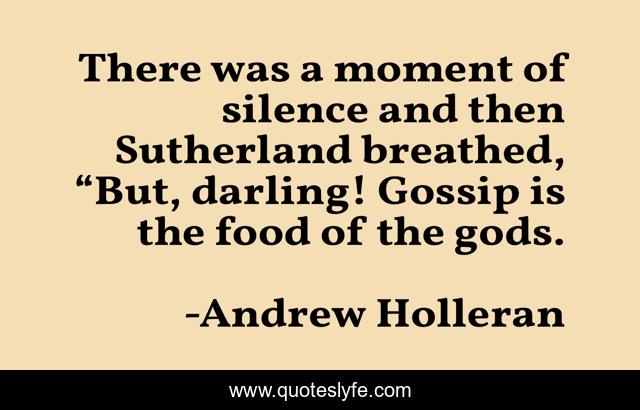 This page presents the quote "There was a moment of silence and then Sutherland breathed, “But, darling! Gossip is the food of the gods.". Author of this quote is Andrew Holleran. This quote is about gossiping, gossip,.