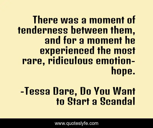 This page presents the quote "There was a moment of tenderness between them, and for a moment he experienced the most rare, ridiculous emotion- hope.". Author of this quote is Tessa Dare, Do You Want to Start a Scandal. This quote is about alpha-male, alpha-male-romance, favorite-heroes, romance, historical-romance,.