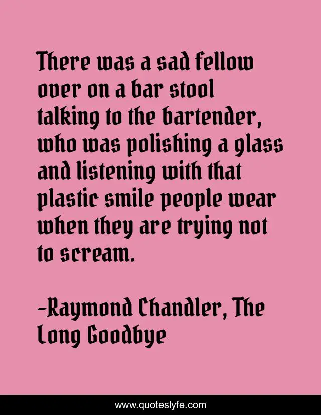 This page presents the quote "There was a sad fellow over on a bar stool talking to the bartender, who was polishing a glass and listening with that plastic smile people wear when they are trying not to scream.". Author of this quote is Raymond Chandler, The Long Goodbye. This quote is about smile, scream, happiness,.